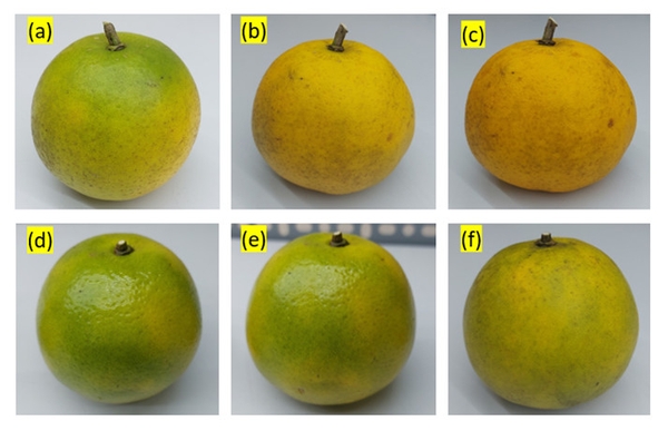 Hình ảnh Cam không sử dụng màng bảo quản: (a) cam theo dõi ở ngày 0, (b) cam sau 5 ngày theo dõi, (c) cam sau 7 ngày theo dõi; Cam có sử dụng màng bảo quản: (d) cam theo dõi ở ngày 0, (e) cam sau 7 ngày theo dõi, (f) cam sau 15 ngày theo dõi