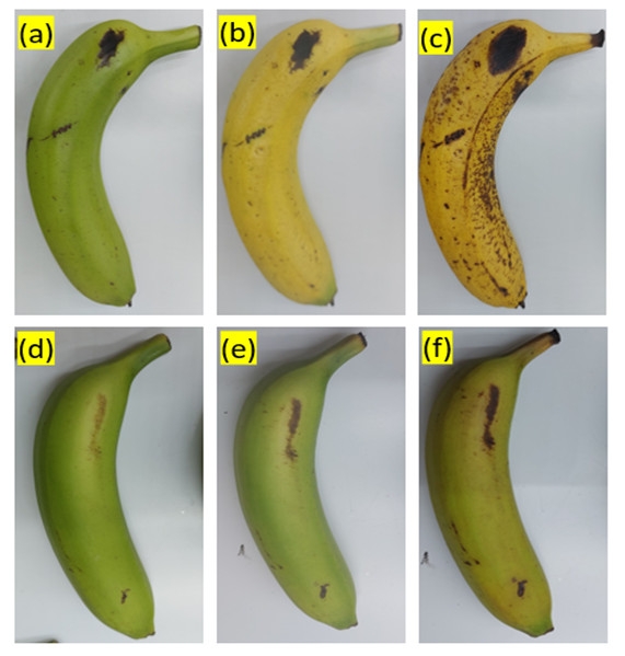 Hình ảnh Chuối không sử dụng màng bảo quản: (a) chuối theo dõi ở ngày 0, (b) chuối sau 2 ngày theo dõi, (c) chuối sau 3 ngày theo dõi; Chuối có sử dụng màng bảo quản: (d) chuối theo dõi ở ngày 0, (e) chuối sau 4 ngày theo dõi, (f) chuối sau 8 ngày theo dõi