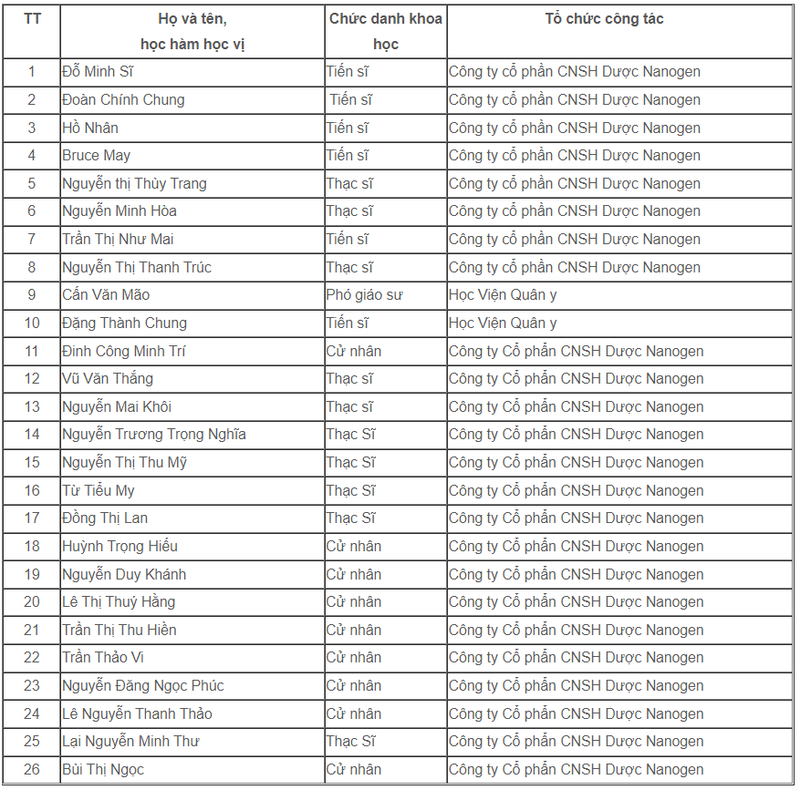 Tổ chức chủ trì nhiệm vụ: Công ty cổ phần CNSH Dược Nanogen;