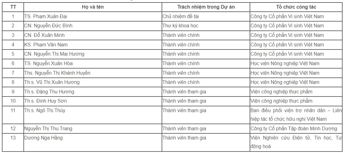 4. Tổ chức chủ trì nhiệm vụ: Công ty Cổ phần Vi sinh Việt Nam